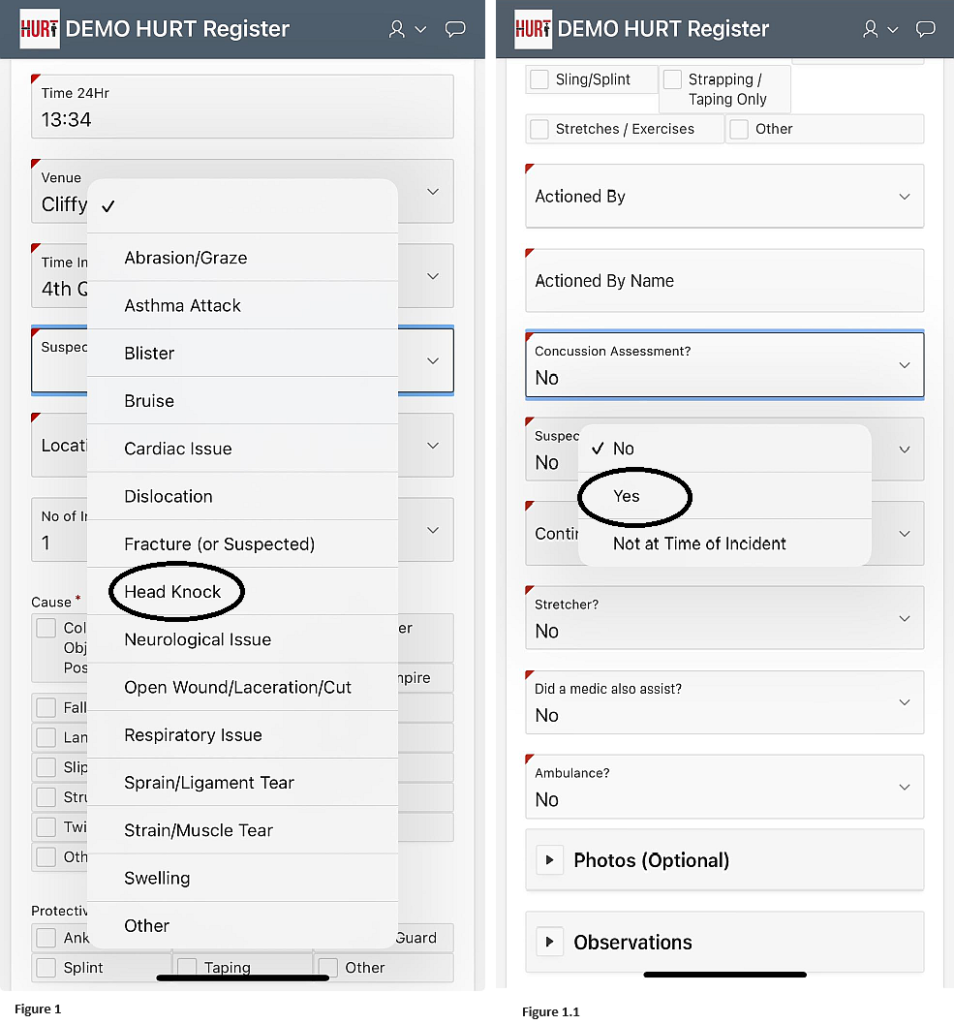 Once in the Incident Creation mode, a Concussion Assessment can be instigated in two ways: